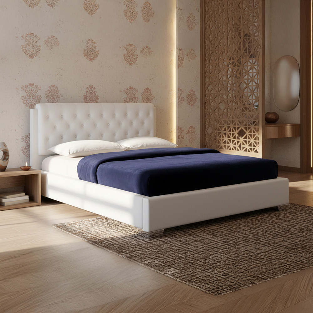 The Amelia Tufted embodies purity, sophistication, and modern grace. Upholstered in luminous white leatherette, it offers the luxurious appeal of fine leather while maintaining an eco-conscious essence. The refined tufting, paired with its minimalist silhouette, creates a serene ambiance that transforms any bedroom into a sanctuary of calm elegance.