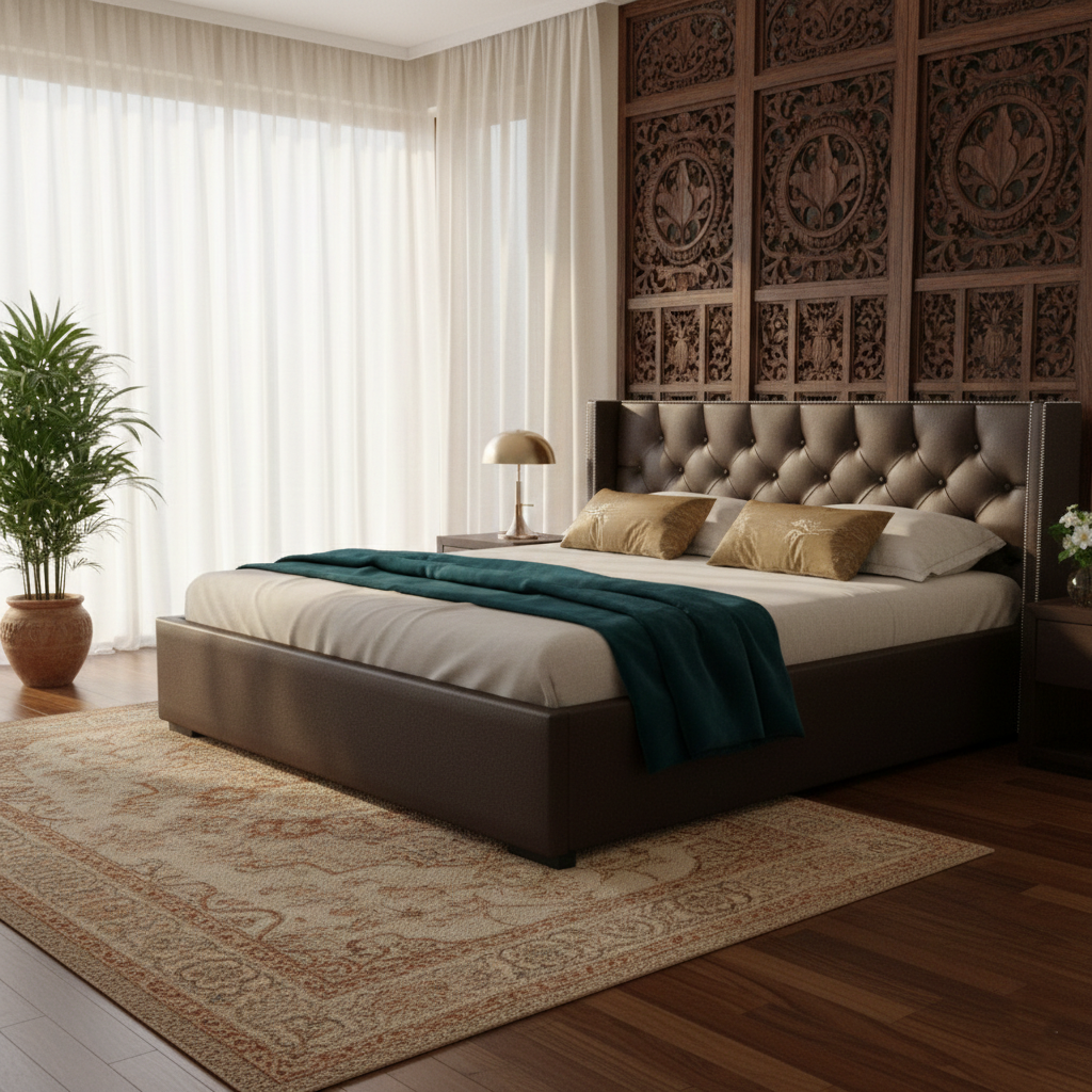 For compact spaces that crave luxury, the Queen size Daisy Bed in Deep Brown leatherette is the epitome of refined charm. Its button-tufted headboard and gently winged edges deliver a stately look, while the rich brown finish adds a touch of cozy grandeur. Perfect for those who desire comfort and class in a more intimate scale.