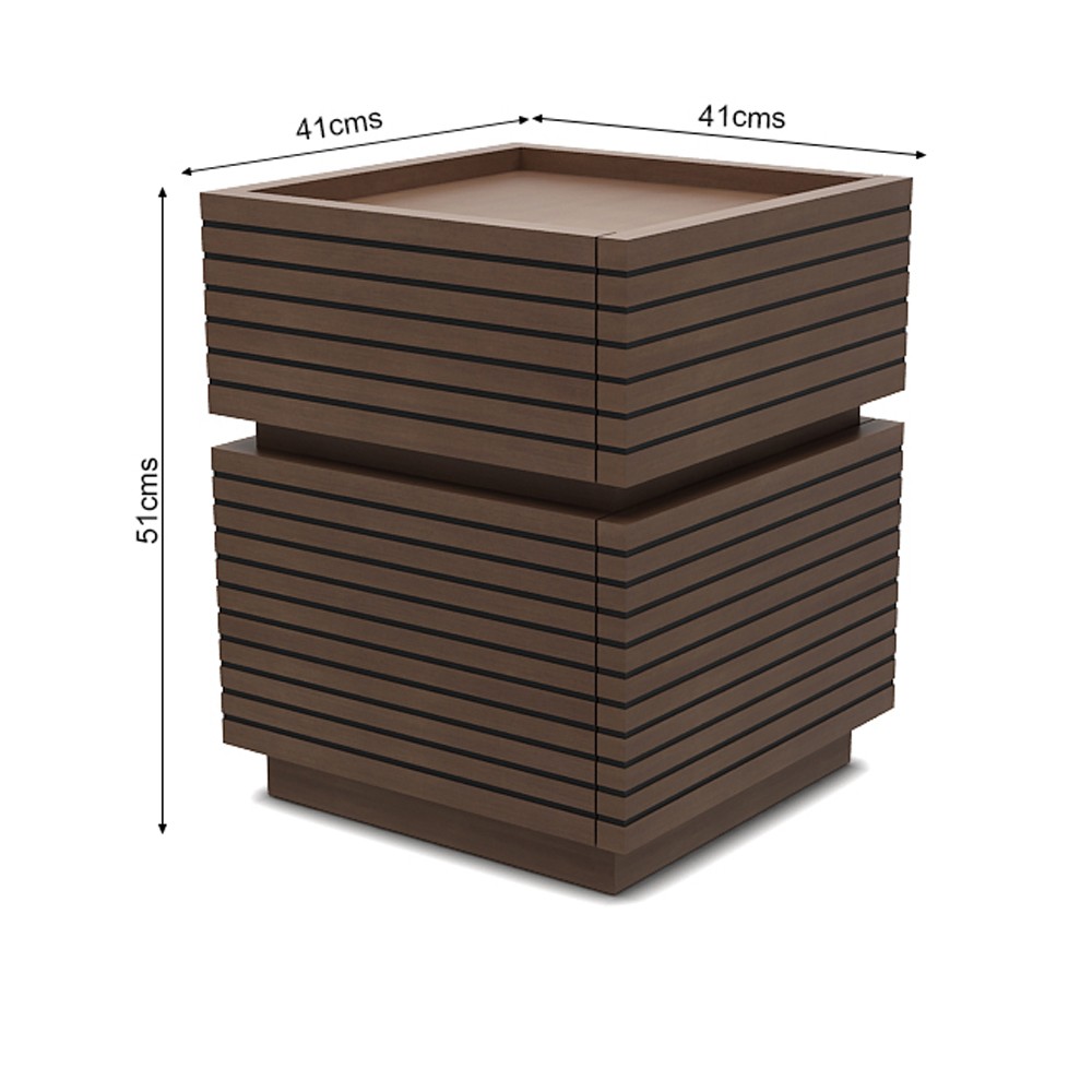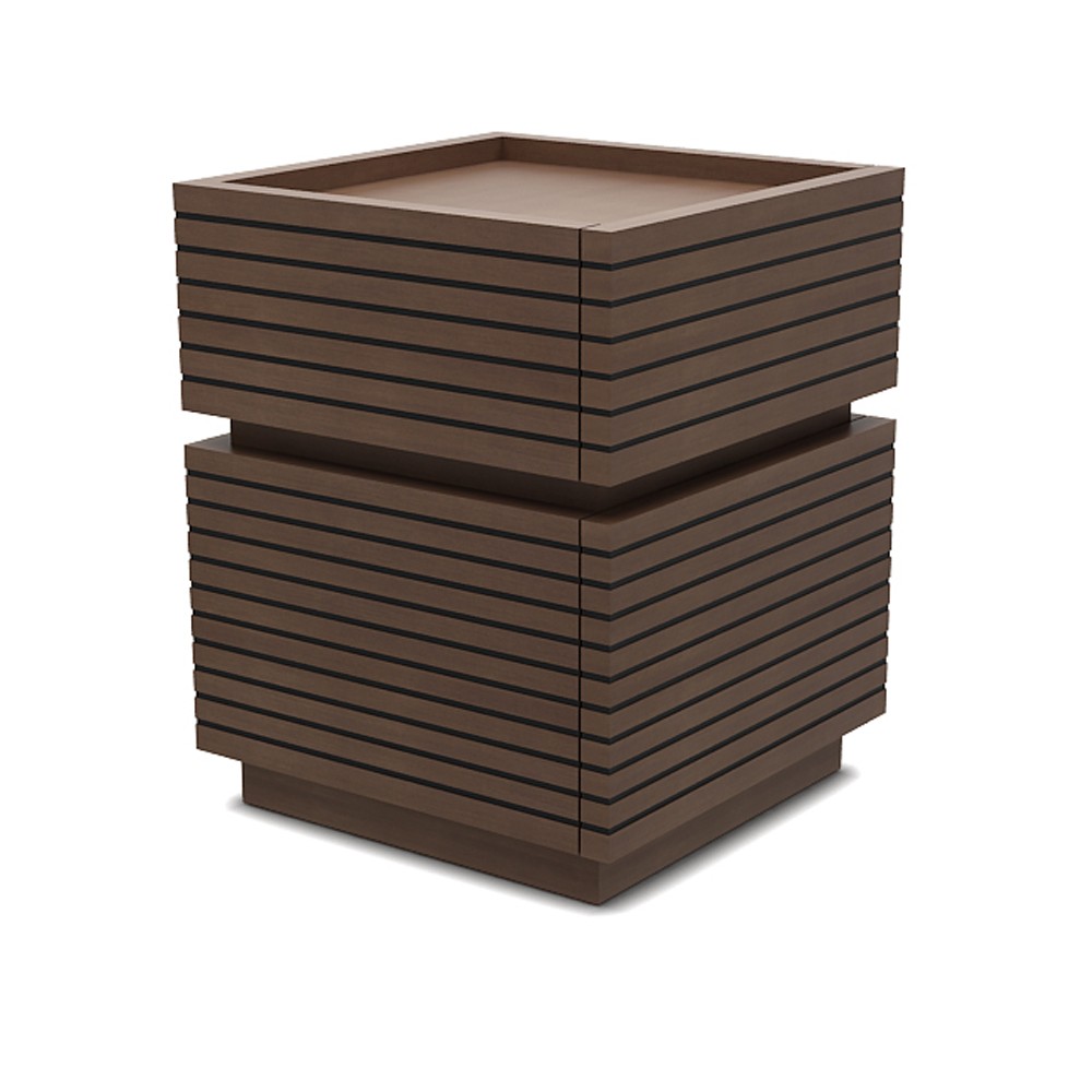 1. This nightstand features a cubic shape with a wenge finish. With the large and small drawer, this item works perfectly for storage.