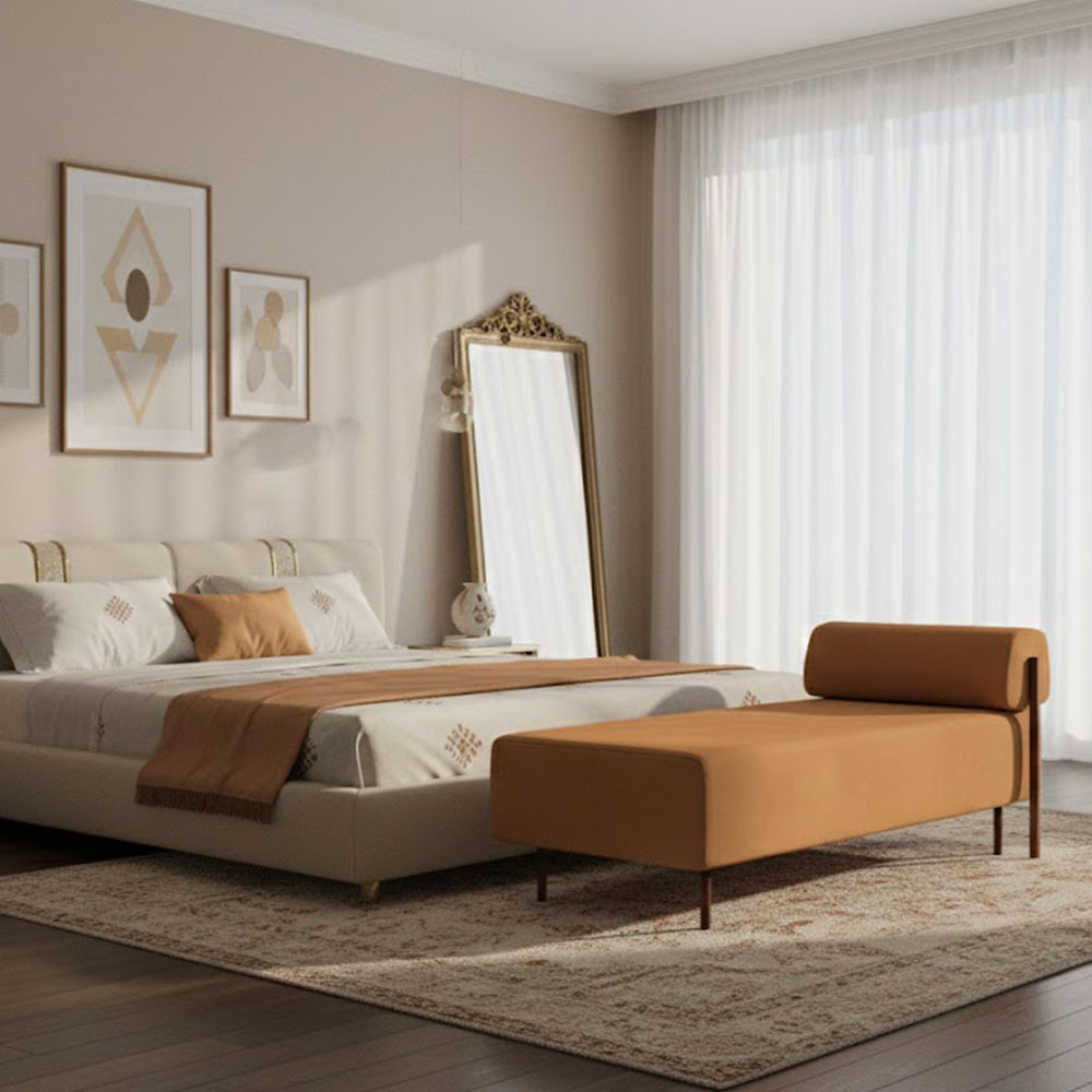 | Size (LxWxH): | 152 x 61 x 43 cms | Style: | Contemporary | Material: | Solid wood structure in Natural finish with Fabric |